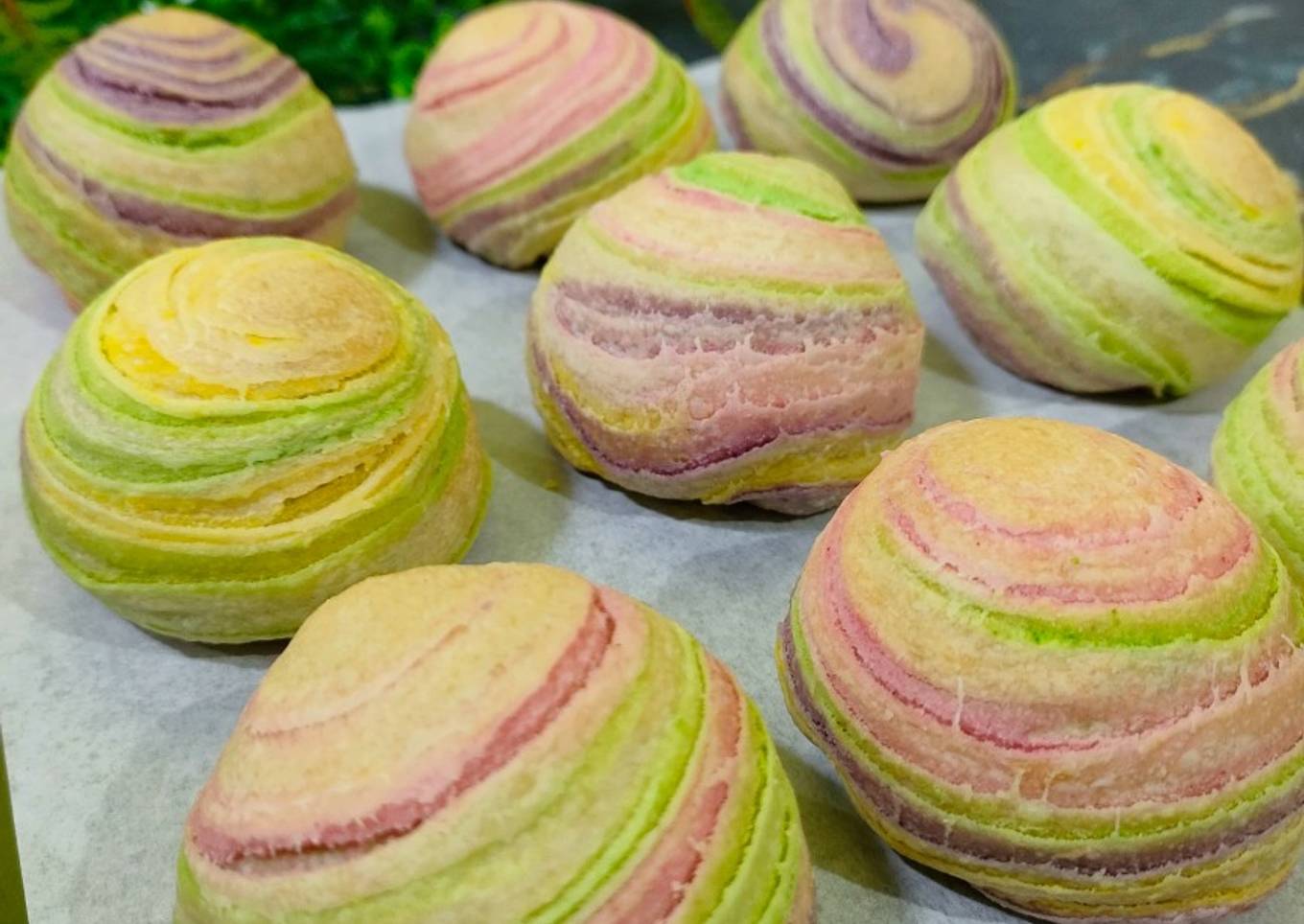 - Ambil satu bagian adonan A, pipihkan dan gilas dg rolling pin. Letakkan adonan B ditengah, 1 bagian utk setiap warna, tutup rapat adonan A / lipat seperti amplop.