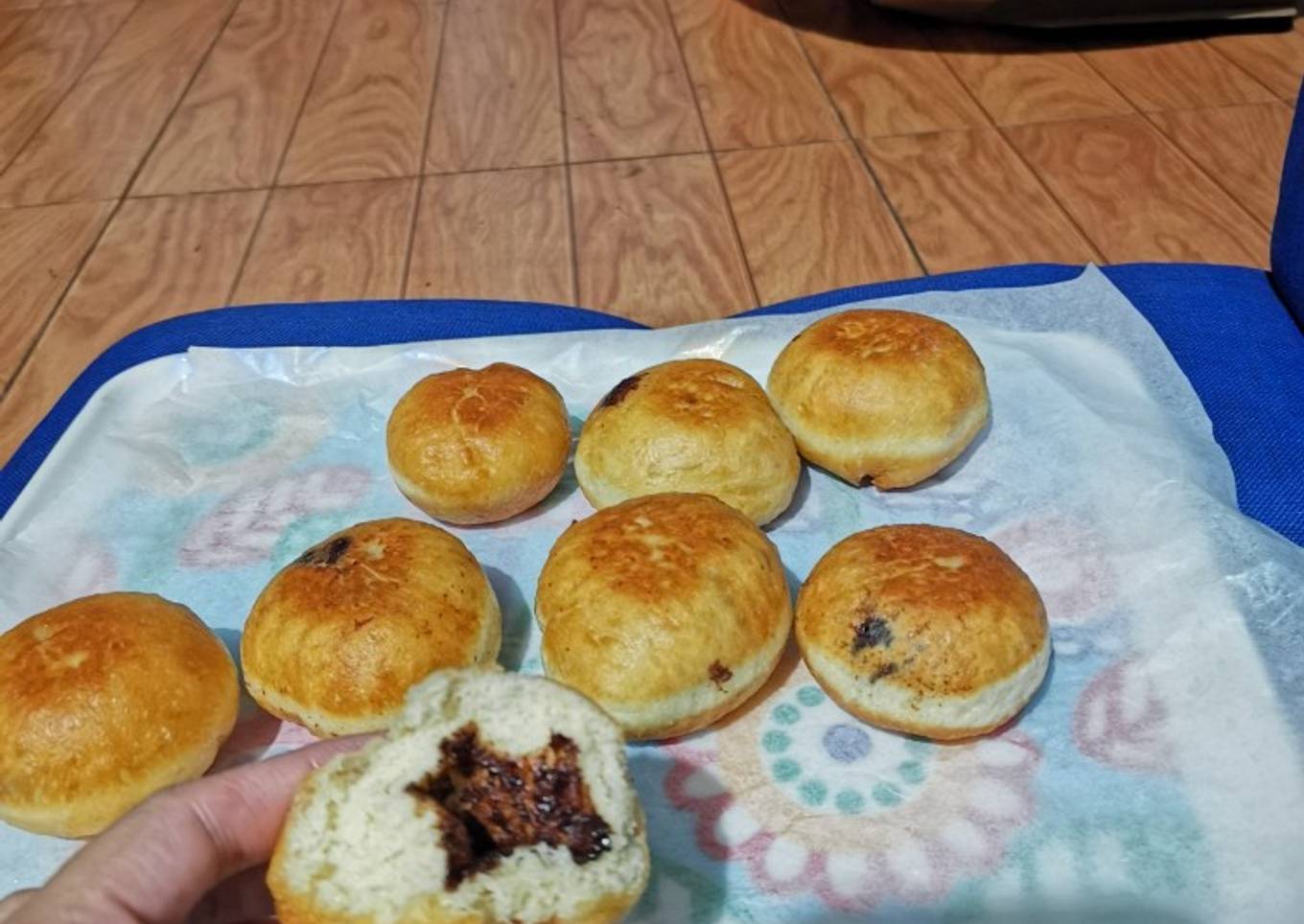 - Lalu diamkan 15 menit...setelah mengembang,dibagi jadi 8 adonan,gempengkan lalu masukan coklat lalu bulatkan adonan sampai habis...