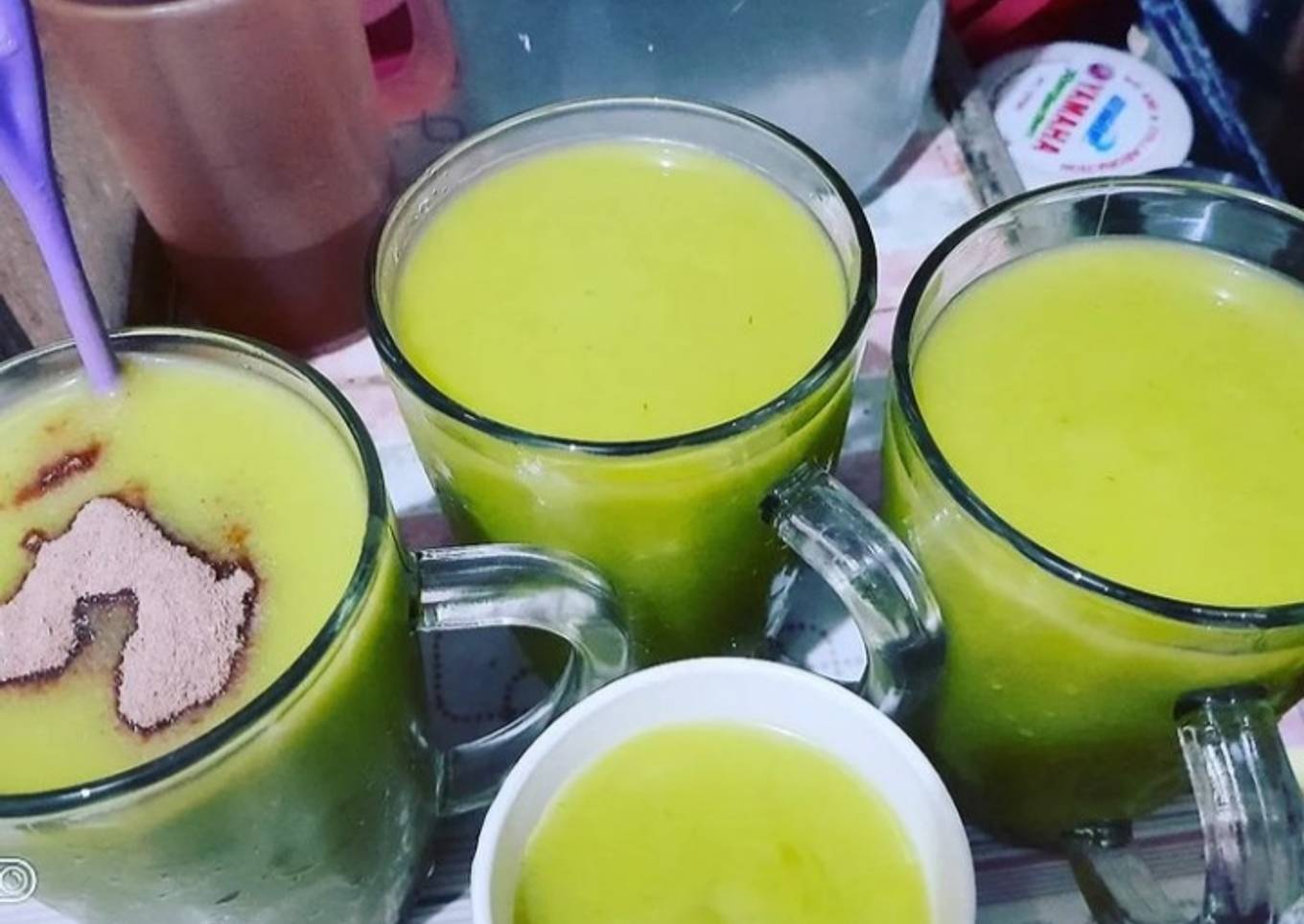 - Blender hingga lembut, tuangkan dalam gelas dan beri toping susu bubuk dancow diatasnya.
