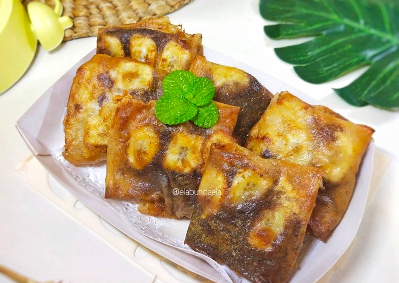 - Siapkan selembar kulit lumpia, isi dengan 3 iris pisang beri Meises dan keju