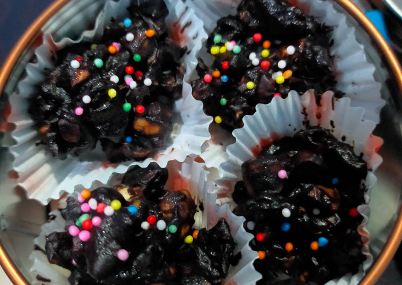 - Lelehkan dark chocolate dengan cari di tim, masukkan kacang mede & kismis aduk sampai rata.