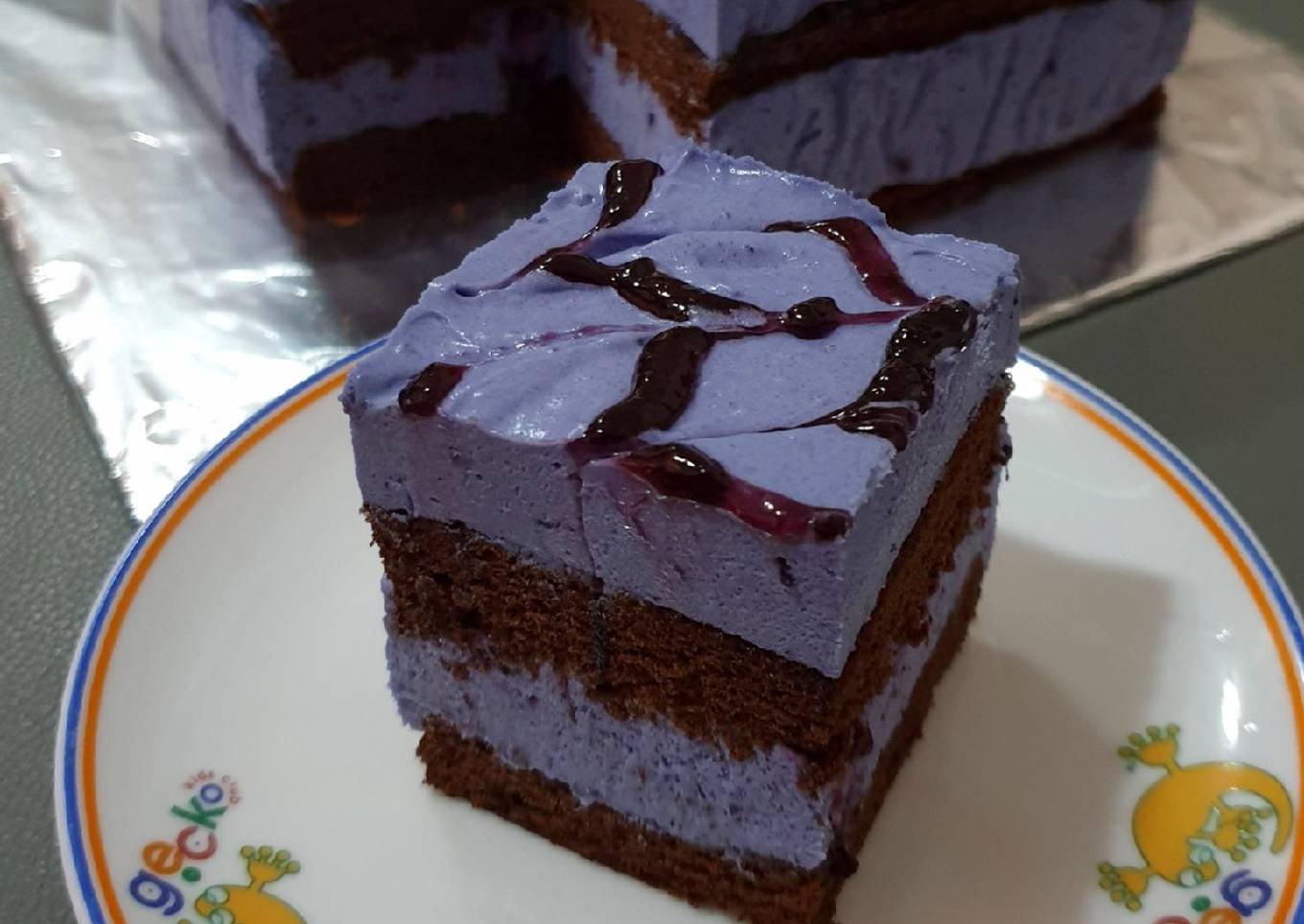 - Olesi sedikit blueberry jam dibagian atas cake, tuangkan cream blueberry ½ bagian, tutup dengan bagian cake 1nya dan olesi kembali dengan sedikit blueberry jam, tuangkan sisa cream blueberry dan hias sesuai selera. Masukkan freezer -/+ 3 jam