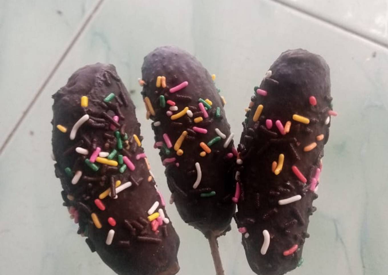 - Stlh pisang beku keluarkan dr frizer lalu celupkan ke adonan coklat 2/3 x agar lebih tebal dan beri mesis