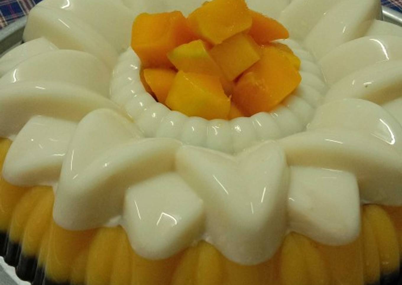 - Blender potongan mangga bersama susu. Campurkan semua bahan lapisan 2, masak sampai mendidih. Tuang ke atas lapisan 1.