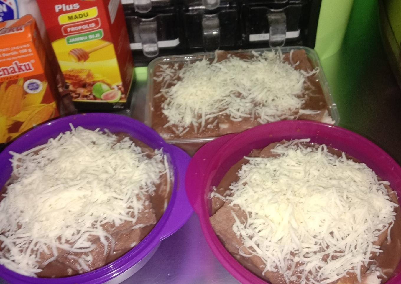 - Aduk2 smpe rada mengentak,,lalu matikan kompor,lalu dinginkan sbntar,,lalu tuangkan kwadah yg sdh dtata roti tawar,tuangkan smpai hbis,lalu ksh parutan keju..stelah itu msukan ke frezer..