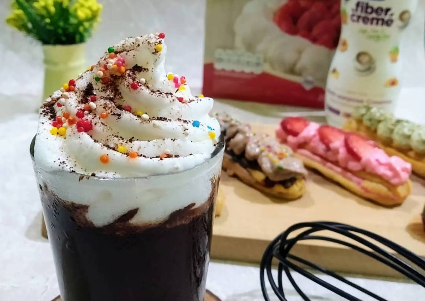 - Siapkan gelas, tuang minuman coklat, lalu semprotkan whipping cream diatas minuman coklat, beri taburan coklat bubuk dan sprinke, sajikan 😋